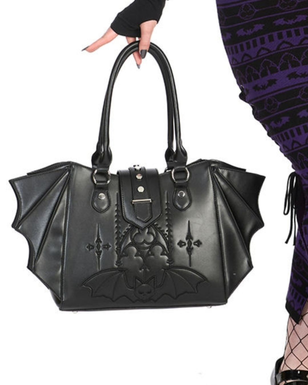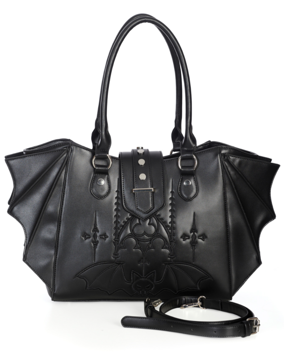 Experience the unique beauty and functionality of our Cathedral Bat Shoulder Bag & Crossbody. Featuring a striking bat design, this bag can be worn as a shoulder bag or crossbody for versatile style. Keep all your essentials close and make a statement with this one-of-a-kind accessory.