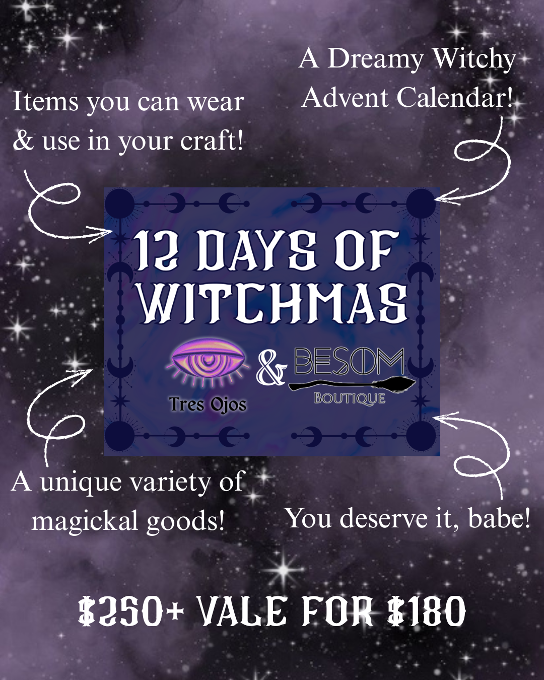 Tres Ojos and Besom Boutique have collaborated to bring you an amazing 12 day advent calendar! With items you can wear and items you can use in your craft this perfectly witchy mystery box is sure to bring the magic this holiday season.